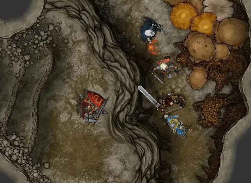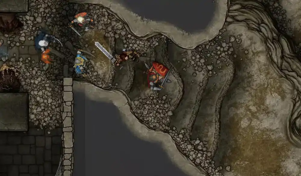Anche Kirsul nel suo tentativo scivola, e Rolf, nell’imitare la sorella, cerca di prendere il paladino, ma dato il peso dell’armatura il barbaro viene travolto.